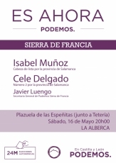 El mismo día tras la reunión participativa el Círculo serrano del partido político organizará un acto de campaña, en este caso, en la Plazuela de las Espeñitas (junto a la Tetería) en el que estarán presentes los máximos responsables de Podemos en la provincia: Isabel Muñoz, cabeza de lista por la provincia de Salamanca, Cele Delgado, número dos y Javier Luengo, Secretario General de la agrupación en la Sierra. El acto dará inicio a las 20:00 h.