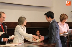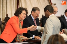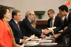 Un total de 155 estudiantes de Iberoamérica y España han recibido en la mañana de hoy los diplomas que acreditan su participación en los distintos programas de movilidad internacional correspondientes al curso 2014-2015, auspiciados por la Universidad de Salamanca y Banco Santander, a través de Santander Universidades, en un acto presidido por Daniel Hernández Ruipérez, rector de la universidad salmantina, acompañado por José Antonio Villasante Cerro, director General de Banco Santander y director global de Santander Universidades, y Juan José Mateos, consejero de Educación de la Junta de Castilla y León.