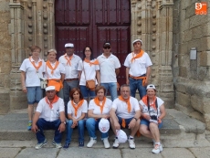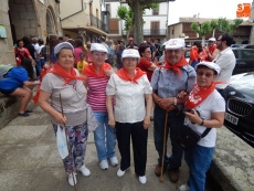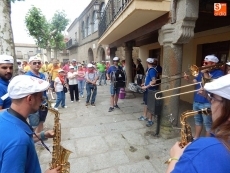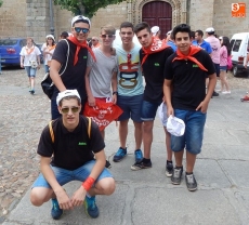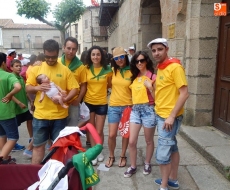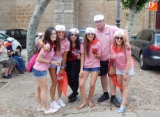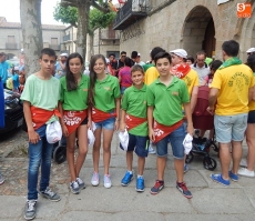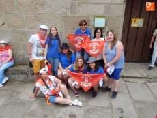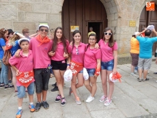 Las pandas de Ledesma toman la Plaza Mayor y la llenan de colorido y buen ambiente. Antes de iniciar camino hacia el prao de la Villa acompañadas por la charanga, las pandas se han concentrado en la plaza para el tradicional reparto de pañuelos rojos y gorras blancas de las Fiestas del Corpus.