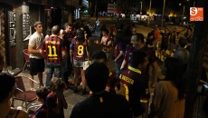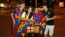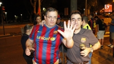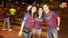 La afición salmantina se echó a la calle y la Polícia Local tuvo que acordonar esa zona de la ciudad charra. Poco a poco se fue juntando cada vez más gente y los hinchas del Barcelona festejaron con gritos como ¡Campeones, campeones! o ¡Barça, Barça!, un título que significa el triplete para la entidad azulgrana.