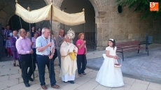 Los vecinos de Gallegos de Solmirón también honraron al Santísimo, y este año, también fue muy especial para Elena Nieto y su familia, ya que tomó la Primera Comunión. Tras recibir esta Sacramento, los feligreses llevaron a cabo la tradicional procesión del Corpus por las calles del pueblo, recibiendo la bendición los distintos altares que se instalaron por esta localidad limítrofe con Ávila. Toda una tradición que los lugareños quieren perpetuar hacia las siguientes generaciones.