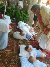 En el municipio de Los Santos, el altar se instaló en el Portalillo. Bajo una alfombra aromatizada con pétalos de rosa y tomillo, los padres colocaron a los más pequeños para que recibieran la bendición del Santísimo. Este año la bendición recayó sobre dos niños y tres niñas, todos ellos nacidos a lo largo del último año.