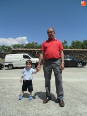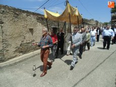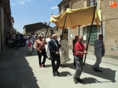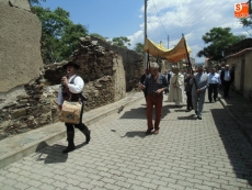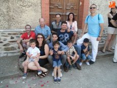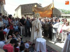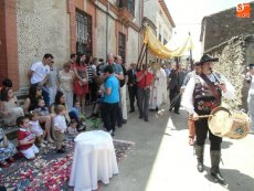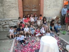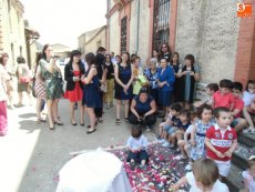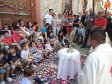 Antes de llegar a la iglesia, en las escaleras de la casa donde nació Filiberto Villalobos, se situó el altar. Sobre una alfombra repleta de pétalos de rosas y tomillo, se dispusieron los menores, en especial, los que han nacido a lo largo de los últimos meses. Ante ellos, se postró el párroco con la Sagrada Forma, para realizar la bendición sobre los niños y niñas, mayores y vecinos en general que se congregaron en este punto.