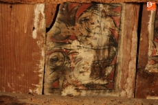 Las obras de restauración del interior de la iglesia de Santiago han deparado una sorpresa mayúscula durante el trabajo de seguimiento arqueológico. Como resultado de estas actuaciones, la arqueologa, Elvira Sánchez, ha hallado unas tablas pictóricas que se encontraban integradas dentro del suelo de la tarima del coro.