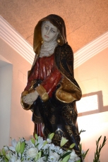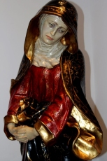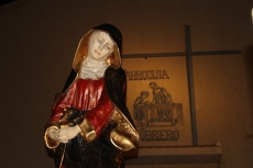 Una imagen tallada a la usanza castellana que salió de las manos de Enrique Orejudo en 1990 y que muestra un momento de tanto dolor como es volver de enterrar a un hijo, vacía, sin consuelo. Una talla que fue esculpiendo sobre un bloque de pino con historia. Madera que durante siglos perteneció a la cubierta de la Catedral y que con su gubia le dio forma.