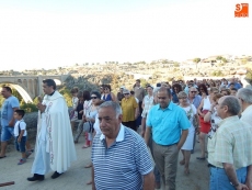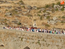 El repique de la campana de la ermita anunció la salida de la Virgen del Carmen, precedida por el sonido de los tamborileros y acompañada por los cofrades, los mayordomos (los de este año portando las varas y los entrantes con los estandartes) y los más fieles que no han querido perderse la cita que aúna tradición y devoción. Tras cruzar el puente, siguió su recorrido por el casco antiguo hasta llegar a la iglesia de Santa María La Mayor.