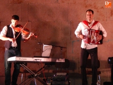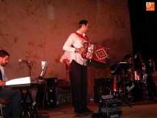 Raúl Díaz de Dios, acompañado de su inseparable acordeón, se ha subido este viernes al escenario de Almenara de Tormes para presentar El fuelle del charro, dentro del programa Noches de Cultura, y con un repertorio de canciones que han llenado la plaza de ritmos étnicos en un concierto de de fusión de estilos y melodías de diferentes puntos geográficos que conviven con la cultura charra.