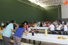 A las dos de la tarde, la gran paella ya estaba lista para comenzar con el reparto de los platos de arroz,aunque los vecinos tuvieron que esperar y guardar cola para hacerse con una de las raciones. La espera contó con la animación de la música de la charanga y, poco a poco, todos los comensales fueron adquiendo su plato de paella para después ocupar su sitio dentro del pabellón.