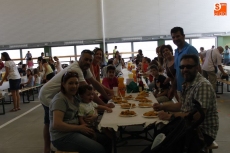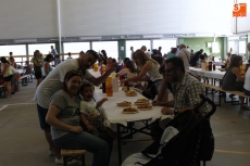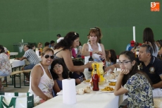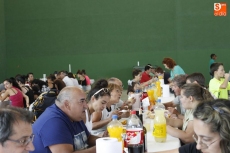 Con caras de cansancio pero con ganas de continuar la fiestas, los vecinos apuran hoy las últimas horas de las celebraciones en honor a Santo Domingo. La jornada dominical comenzó pronto, con el desayuno que el alcalde ofreció a las peñas, y ha tenido su acto central en la paella solidaria que más de 1.100 personas han podido degustar en el pabellón municipal y su inmediaciones.