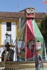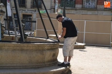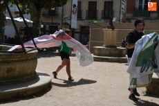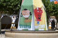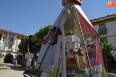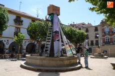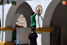 Al mismo tiempo, se desmontó la estructura que ha recubierto estos días la fuente de la Plazuela, y se retiraron los escudos anunciadores de todas las ediciones pasadas de la Feria de Teatro y del Divierteatro repartidos por todos los arcos.