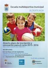 Hasta el próximo día 30 de septiembre está abierto el plazo de matrícula de la Escuela Deportiva de Aldeatejada (Futbol Sala y Baloncesto). Escuela en la que pueden participar todos los niños nacidos entre 1998 y 2011, y este año especialmente se busca incentivar la participación de los niños nacidos en 2008 y 2009 para intentar seguir siendo campeones prebenjamines.