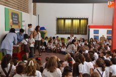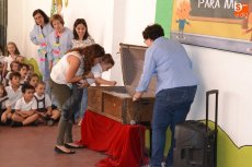 Tras empezar a trabajar sobre este lema en cada clase en la jornada del jueves y en la primera parte de la mañana del viernes, el acto consistió en una puesta en común con un cofre como gran elemento de atención, del cual los representantes de cada clase fueron extrayendo una moneda simbólica y una caja con canicas en representación de cada alumno.