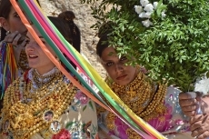 Hay algo aquí que despierta el rumor de los sentidos: lo humano femenino -esa mirada que nos llega desde el fondo, con toda su intensidad- está envuelto por oropeles, cintas multicolores en diagonal, un hermoso ramo de fresno, para que advirtamos cómo los ritos y celebraciones no son algo trivial, sino que requieren una intensa preparación, para que nuestros sentidos se activen y perciban toda la belleza del mundo y el hondo sentido que tiene toda celebración.