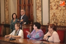 El presidente de la Diputación, Javier Iglesias, ha recibido este viernes, en el Palacio de La Salina, a los cinco salmantinos que participan en la Operación Añoranza 2015. Se trata de cuatro mujeres y un hombre que salieron de la provincia en su infancia y no habían podido regresar desde entonces: Aniceto González Rodríguez, nacido en Salamanca en 1945, Felisa Fraile González (La Alberca, 1933), Stella Maris Hernández Muñoz (Miranda del Castañar, 1951), Julia Hernández del Brío (Parada de Rubiales, 1940) y María Consuelo Junciel García (Salamanca, 1936).