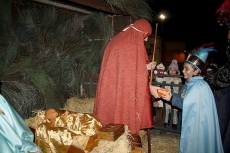Bajo los arcos de la Casa Consistorial aguardaban en un pequeño portal José, María y el Niño Jesús, que recibieron los tradicionales presentes, oro, incienso y mirra, de manos de los pajes, siempre fieles a los Reyes Magos en esta noche mágica y que mostraron con SS. MM., más que nunca, sus deseos por la unidad y el entendimiento como objetivo común de todos sus vecinos para afrontar cualquier dificultad.