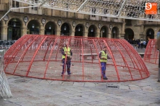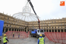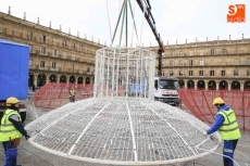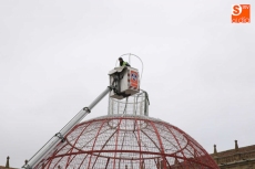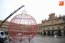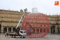 La gran bola roja de la Plaza Mayor, que durante la Navidad se ha convertido en un gran atractivo, se despide con el desmontaje que han comenzado la mañana de este jueves los operarios. Con casi 13 metros de altura y 10 de diámetro iluminados con más de 6.600 metros de cables y luces, ha sido la gran protagonista de todas las imágenes realizadas en el ágora durante estas fiestas.
