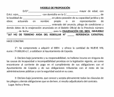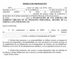 "PROPOSICIÓN PARA TOMAR PARTE EN LA SUBASTA ENAJENACIÓN DE UNA PARCELA DE TERRENO UBICADA EN EL POLÍGONO INDUSTRIAL, DENTRO DE LA PARCELA 1.072, POLÍGONO 2-D". El expediente podrá ser examinado en las dependencias municipales"