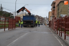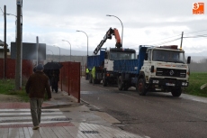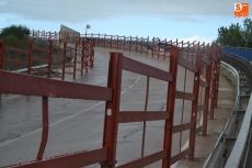 Concluido el montaje de este tramo de campo del encierro a caballo, en la mañana del lunes el trabajo principal de los operarios municipales consistió en la instalación de los toriles desde los que saldrán los encierros urbanos, que una vez más volverán a estar ubicados en un solar entre las calles Duero y Miño.