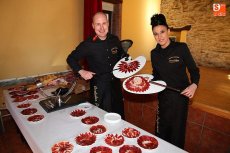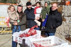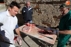 A las once de la mañana se recibió al cerdo, que pesó un total de 16 arrobas (184 kilogramos) y se sacrificó a la manera tradicional. Los matarifes explicaron el proceso paso a paso, desde el desangrado hasta el despiece de la carne, pasando por el recorte de los jamones o la obtención del manto de tocino. También se aprovechó para elaborar chorizos a la antigua usanza. El público disfrutó tanto de la música, a cargo del conocido tamborilero El Mariquelo, como de aguardiente y dulces típicos para combatir el frío. A continuación se ofreció un convite con delicioso jamón ibérico recién loncheado por la pareja de cortadores Roberto López y Puri Garabaya. No faltó tampoco embutido, queso o bebidas.