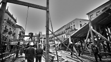 Como astilleros de la alegría donde se lija el color y la luz, así los hombres que traen la madera y preparan la plaza donde transita el convite de máscaras, allí en la que los ojos y las palabras convocan a la murga y al mundo.