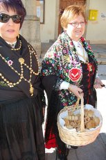 Rosquillas y flores elaboradas por las aguederas son parte del convite, junto con un chupito de aguardiente, que se ofrece a quienes van encontrando a su paso en los pasacalles que hacen a lo largo del día de Santa Águeda, jornada que comenzaba con la entrega del bastón de mando por el alcalde, José Mari González, a la nueva alcaldesa por un día, cargo que este año recayó en Pepa Simón.
