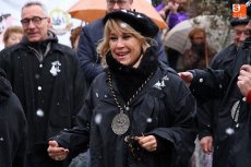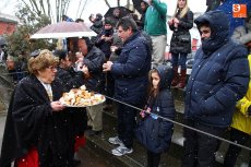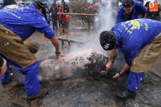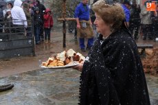 La nieve, que comenzó a caer con fuerza en torno a las doce y media, aceleró el proceso de matanza, y los matarifes dieron rápido muerte al animal para proceder al despiece al ritmo de la gaita y el tamboril de Alberto Vela 'El Turuta', otro de los que aguantó al pie del cañón. El público aguanto estoicamente presenciando la fiesta, y disfrutando de los productos típicos servidos por las Águedas de Guijuelo. Una jornada dura por las inclemencias del tiempo, que recordaron la vida de los arrieros, en los incipientes tiempos de la industria chacinera de la villa.