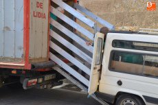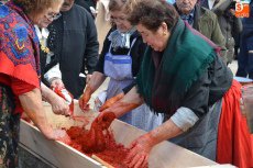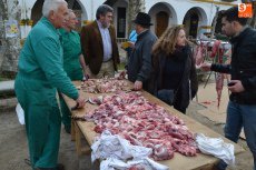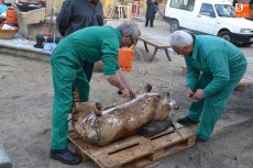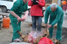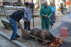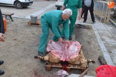 Poco después de las 9.30 horas, se fue a buscar a un camión aparcado en la Plazuela del Conde el cebón donado por Juan Manuel Criado que fue protagonista de toda la mañana. Una vez aturdido, se llevó a la Plazuela del Buen Alcalde, para desarrollar por parte de matarifes, trabajadores del Ayuntamiento e integrantes de El Botón Charro el proceso íntegro de la matanza: chamuscao y raspao, despiezao y descarnao, picao y adobao, y enfusao o llenao.