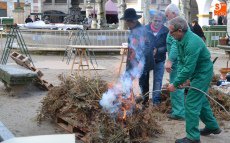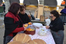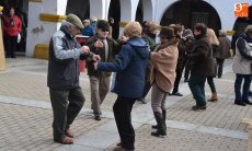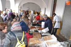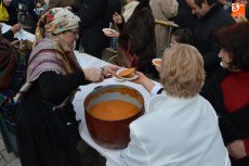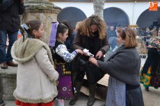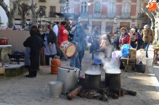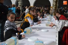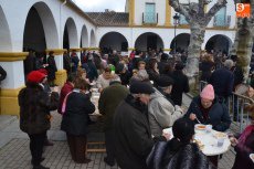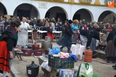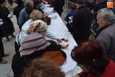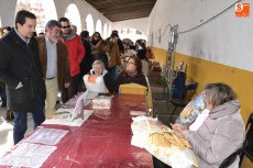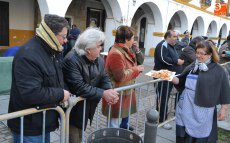 Tras pasar por la Plaza Mayor, parte de la Corporación volvió a la Plazuela del Buen Alcalde para disfrutar de la degustación de patatas meneás y productos cárnicos del cerdo, preparados a lo largo de la mañana (así como en días anteriores) por las hermanas Olaya (Rosario, Pilar y Antonia) y por integrantes de El Botón Charro, que también se encargaron de su reparto. El Botón Charro fue protagonista por otra vía, ya que sus integrantes más pequeñas ofrecieron una exhibición de baile junto a un tamborilero.