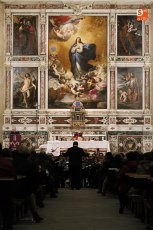 La iglesia de la Purísima ha acogido en la tarde-noche del sábado un concierto de la Banda de Música de Alba de Tormes, siendo este uno de los actos a realizar para conmemorar los cuatrocientos años que cumple la procesión del Encuentro de la Vera Cruz. La experimentada batuta de Mario Vercher Grau y la sentida palabra de Toño Blázquez han llevado a la Purísima a viajar por la Pasión entre letras y notas.