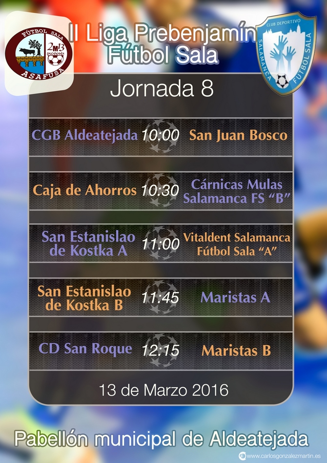 Durante la mañana del domingo se disputará la octava jornada de la II Liga Prebenjamín de Fútbol Sala, que se desarrollará en el Pabellón Municipal de Aldeatejada.