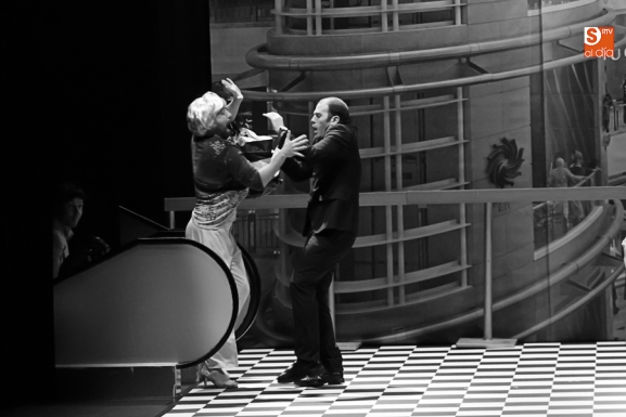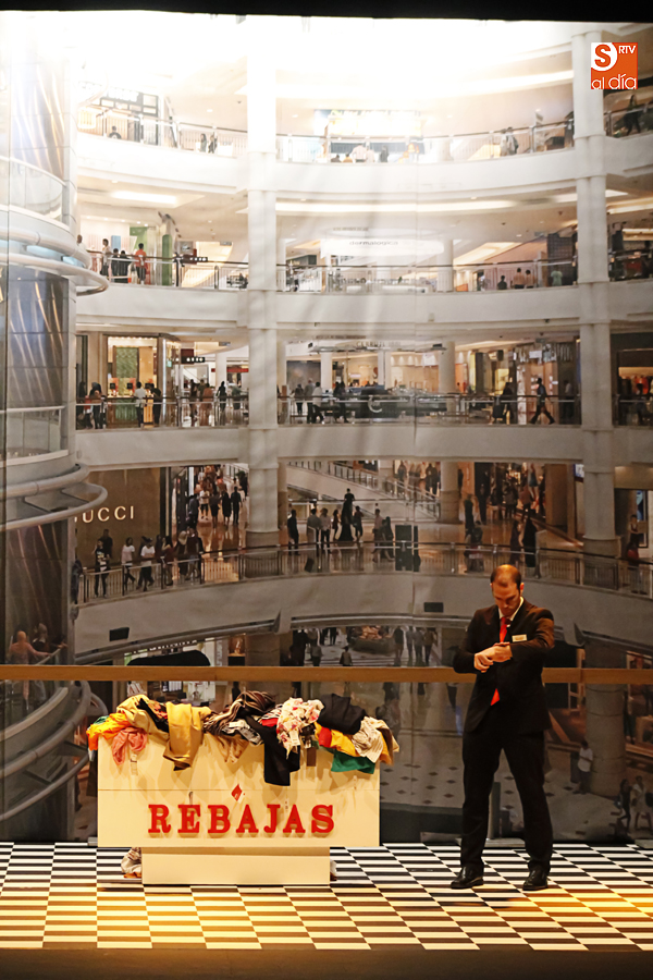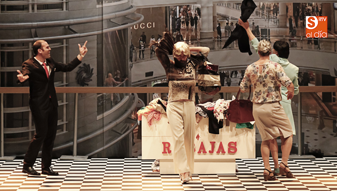 Un encargado enfermizamente ambicioso, vanidoso y obsesionado con el dinero y las mujeres es el centro de la trama principal de 'Galerías Tonterías'. El último montaje de Spasmo Teatro, que la compañía salmantina ha representado este sábado con éxito, en dos pases, en el Liceo.