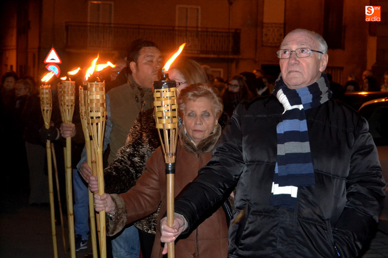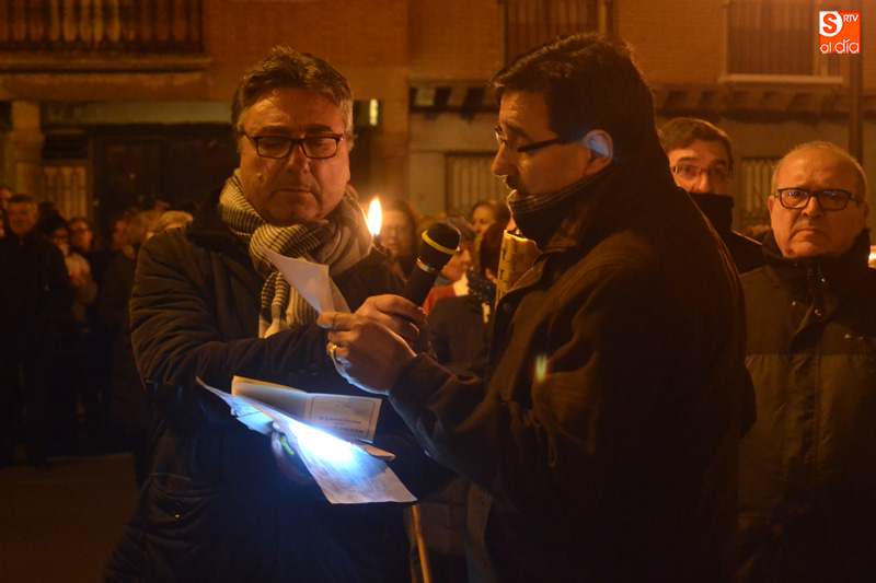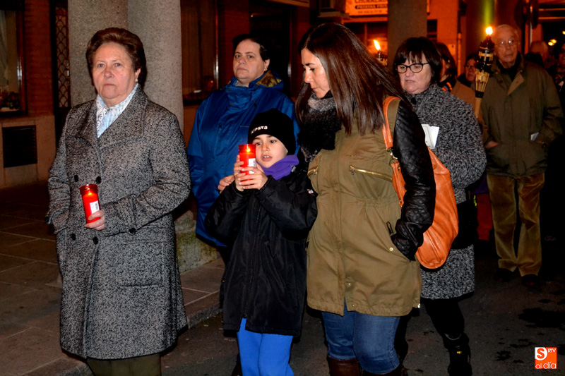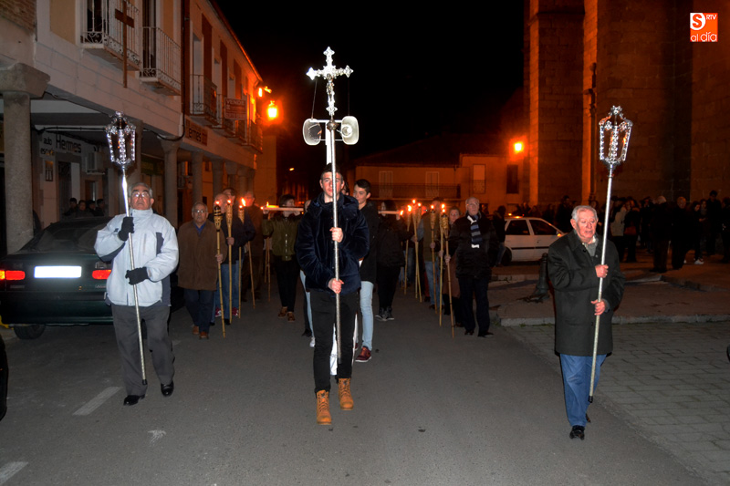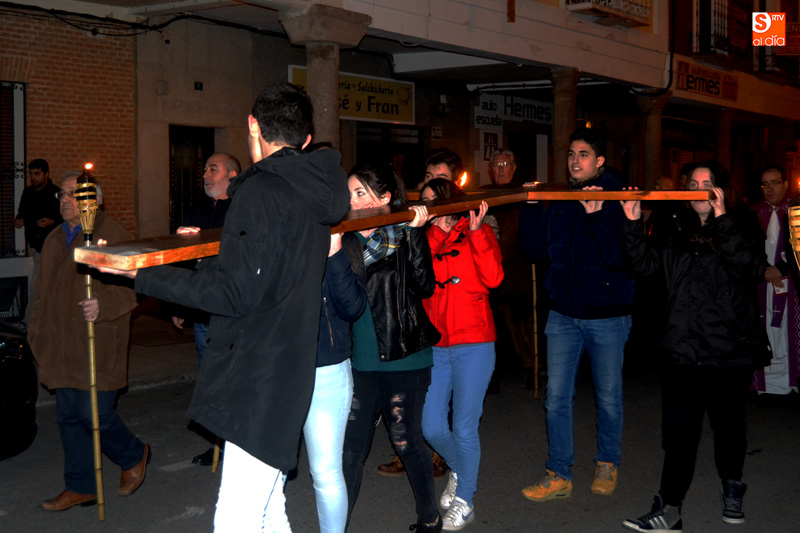 Un centenar de personas han formado una comitiva que iniciaba su camino desde la iglesia parroquial San Miguel Arcángel pasadas las ocho y media de tarde, comenzando a realizar las diferentes paradas que han conformado las Estaciones, y que se han distribuido entre las plazas de España y Constitución, entre un ambiente de respeto y sobriedad.