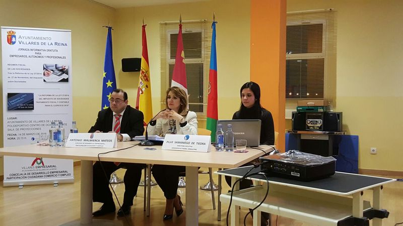 El Ayuntamiento de Villares de la Reina, a través de la Concejalía de Participación Ciudadana, Desarrollo Empresarial, Comercio y Empleo y con el apoyo de la Asociación de Empresarios (AEPOV), celebró este lunes una interesante Jornada Informativa Sobre Tratamiento Fiscal y Contable de las Sociedades Civiles y Comunidades de Bienes para el ejercicio 2016 que fue impartida por Pliar Samaniego de Tiedra , directora ejecutiva de los Servicios Jurídicos de la reconocida empresa Samaniego & Tiedra Consulting.