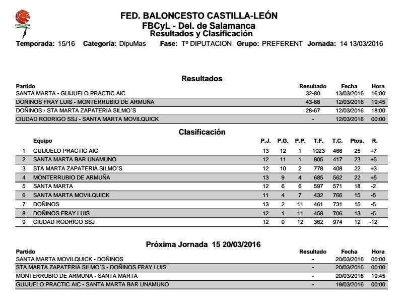En la categoría preferente de los hombres también existe máxima rivalidad en la parte de arriba. Guijuelo es primero con una derrota empatado a puntos con el Santa Marta Bar Unamuno, que también tiene solo una derrota.