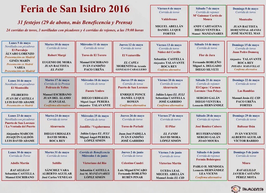 17 de mayo: Corrida de la Prensa. Toros de Pedraza de Yeltes para Manuel Escribano, Juan del Álamo y Juan Leal, que confirma