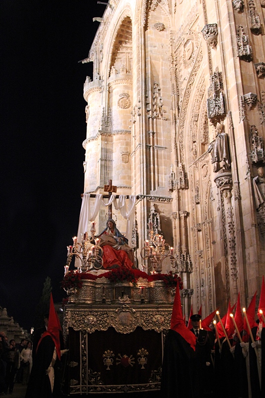 La talla de Mariano Benlliure es sin lugar a dudas la imagen mariana con más devoción de la Semana Santa de Salamanca. Durante todo el año cientos de fieles la visitan en su capilla de la Catedral y la esta noche de luto es ella la que los visita. Miles de salmantinos salen a la calle en una noche que se llora la muerte de Cristo y que se rompe el silencio con los aplausos a la salida. La salida, espectacular por la Puerta del Obispo de la Catedral Nueva, con una lluvia de pétalos para recibirla. Destacar su paso por la Plaza Mayor donde en directo se canta el "Ave María" mientras la imagen recorre el ágora salmantina.