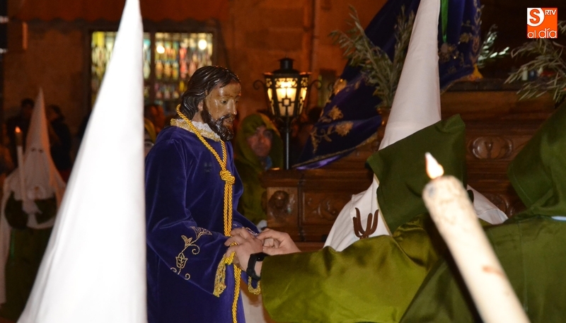 Una vez en el ágora mirobrigense, y con los pasos alineados, se bajó la imagen del Prendimiento al suelo, para proceder a atarle las manos, reflejando precisamente el momento exacto del Prendimiento. Tras ello, y una vez la procesión se volvió a poner en marcha, fue el paso de la Oración del Huerto el que fue por delante hasta el final de la procesión, que se desarrolló en una noche algo fría pero con el cielo tranquilo.