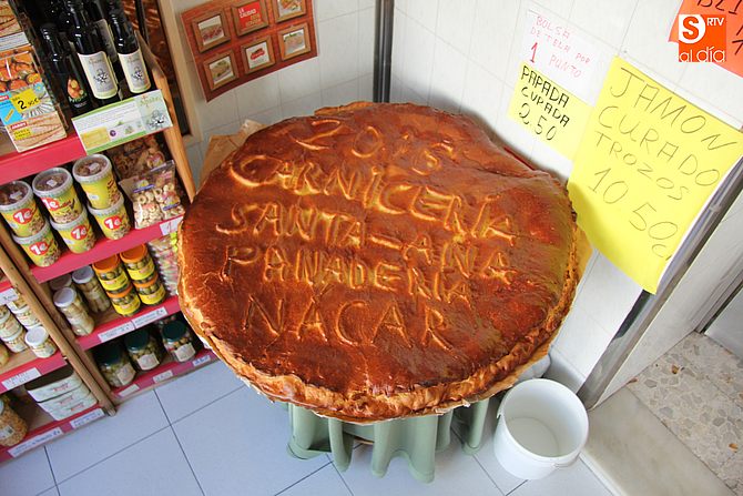Como cada Miércoles Santo desde hace ya once años, Carnicería Santa Ana reparte entre sus clientes un centenar de raciones de empanada. Algo más de diez kilos de masa y seis de carne, componen este extraordinario souvenir de Pascua que ha sido elaborado por Panadería Nácar, de la que sobresale de la tabla de una mesa-camilla de 80 centímetros de diámetro.