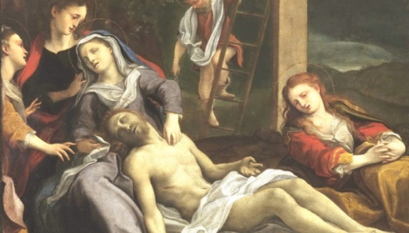 'La Quinta Angustia', también llamada 'Lamentación ante Cristo muerto', es un óleo pintado sobre tabla de madera de nogal realizado a mediados del siglo XVI. Reproduce un original de Correggio pintado para la iglesia del Monasterio de San Juan evangelista de Parma (Italia), aunque difiere en su estudio lumínico y cromático.