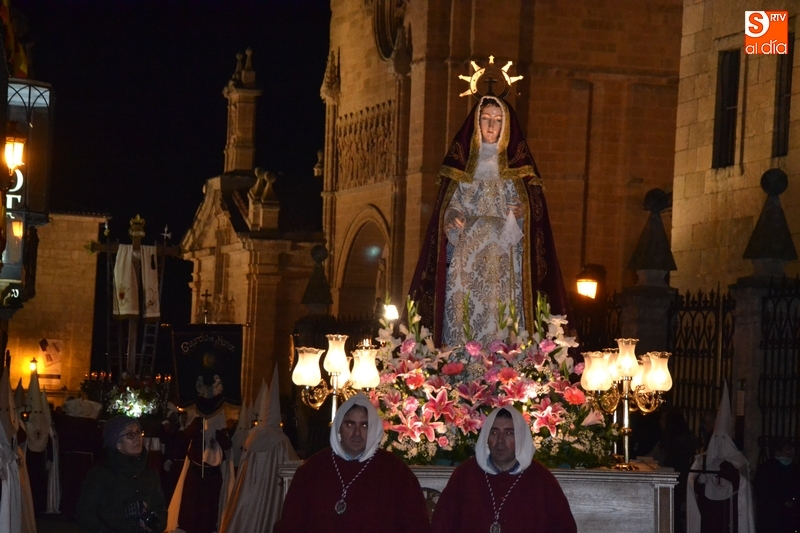 La procesión transcurrió a un muy buen ritmo, tardando una hora y cuarto -desde que se puso verdaderamente en marcha- en regresar a la Catedral de Santa María, todo ello contando además con el habitual parón a su paso por la Plaza Mayor para el rezo del Vía Crucis, dirigido desde la balconada del Ayuntamiento mirobrigense por el capellán de la Cofradía, Celso Martín Santos.