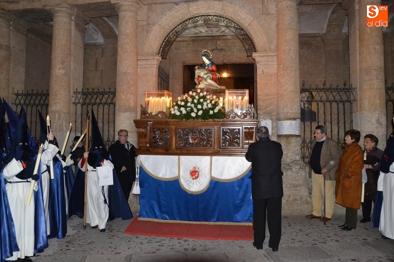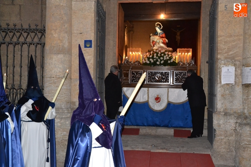 Una vez actuó la Coral, el paso de la Virgen de las Angustias bajó toda la Plaza Mayor, saliendo de la misma por la calle Cardenal Pacheco en dirección al Pórtico del Perdón de la Catedral. A las puertas del mismo se rezó como es tradicional una Salve, guiada por el capellán de la Cofradía, José Manuel Carballo.