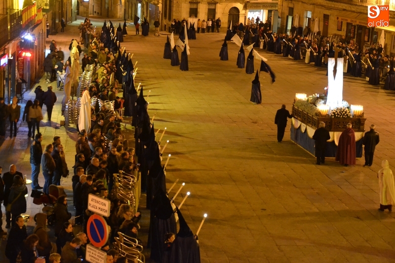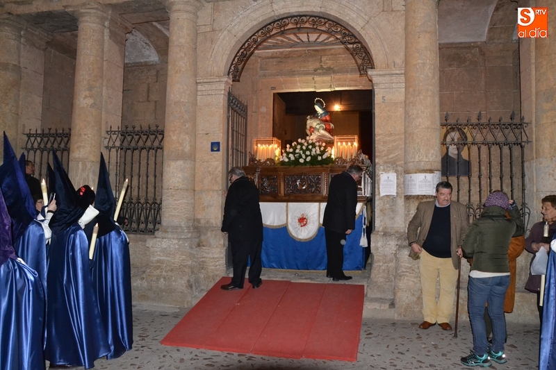 Tras salir de la Plaza por la calle San Juan, la procesión fue por la Plazuela Cristóbal de Castillejo, Campo del Pozo, Enrique Zarandieta y Rúa del Sol para alcanzar de nuevo el ágora mirobrigense. Allí, antes de la segunda actuación de la Coral, Nicolás Martín Matías invitó a todos los presentes a guardar un minuto de silencio en memoria de las víctimas de los atentados terroristas del martes en Bruselas.
