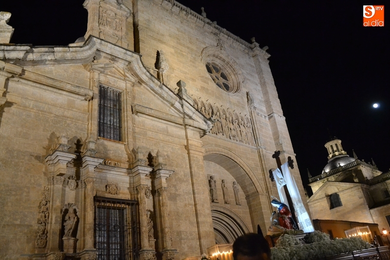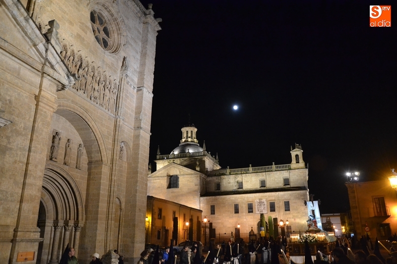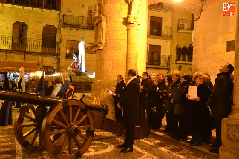 La primera de ellas fue nada más ponerse en marcha la procesión en la Iglesia de la Venerable Orden Tercera, a cuyas puertas se le colocó la cruz al paso. Como es habitual, este tramo de salida de la procesión fue seguido por numerosos mirobrigenses, que guardaron un respetuoso silencio para escuchar a la Coral. Antes y después de la actuación, pronunció unas palabras desde la balconada del Ayuntamiento uno de los canónigos de la Catedral, Nicolás Martín Matías.