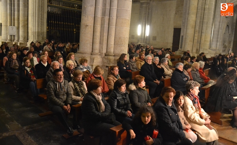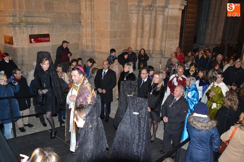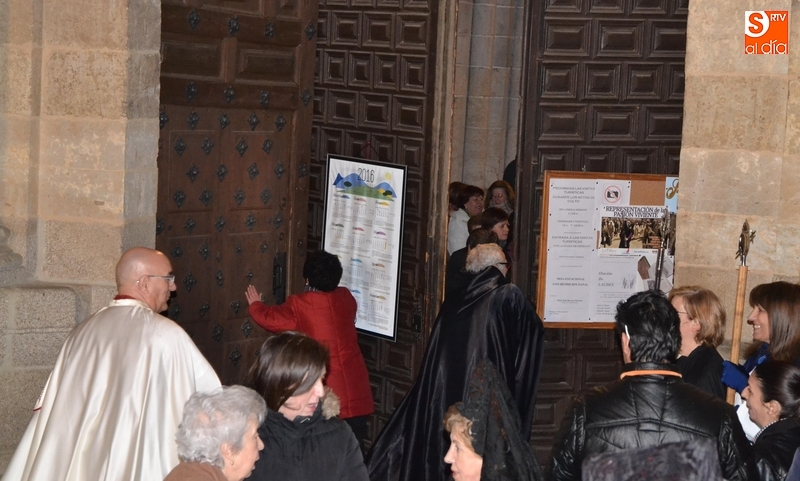 Una vez concluido el sermón, se abrieron las puertas de la Catedral para que salieran las personas que había en el interior del templo, unas cuantas de ellas de luto riguroso ataviadas con mantilla. Algunas de estas personas portaron las banderolas de la Cofradía, y dos de ellas, María Corvo López y Auri López de Arriba, las varas como mayordomas de este año de la Virgen.