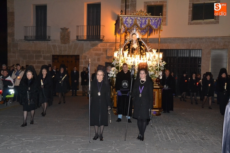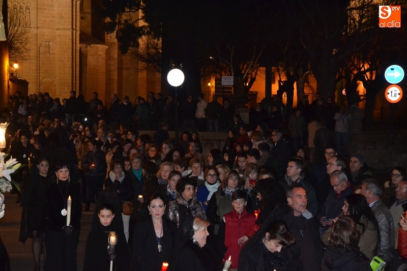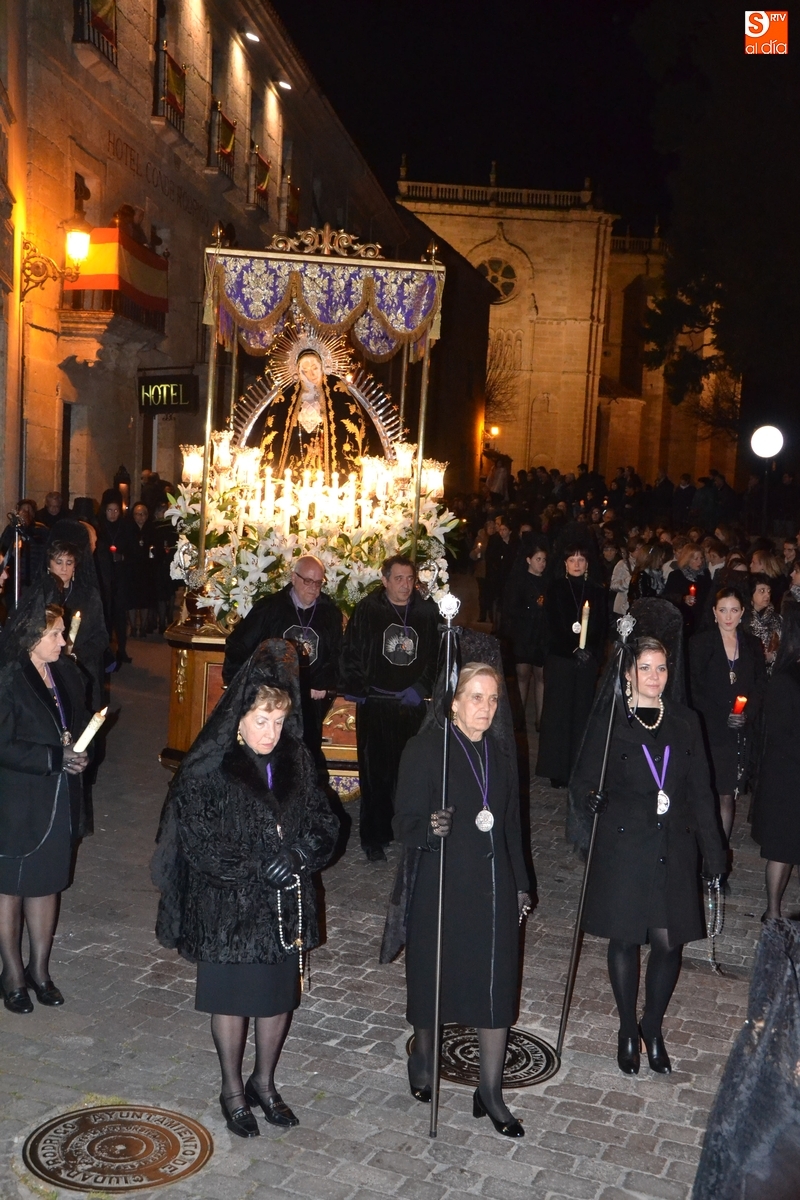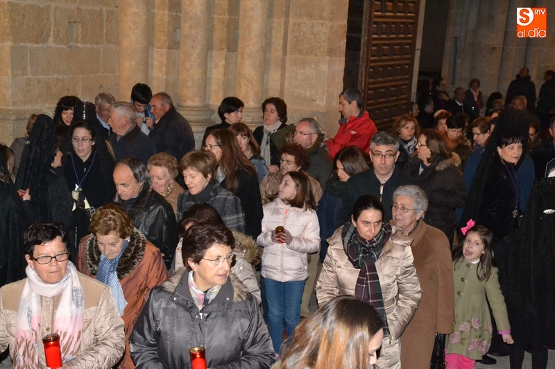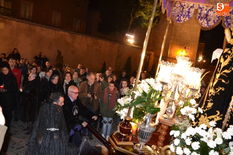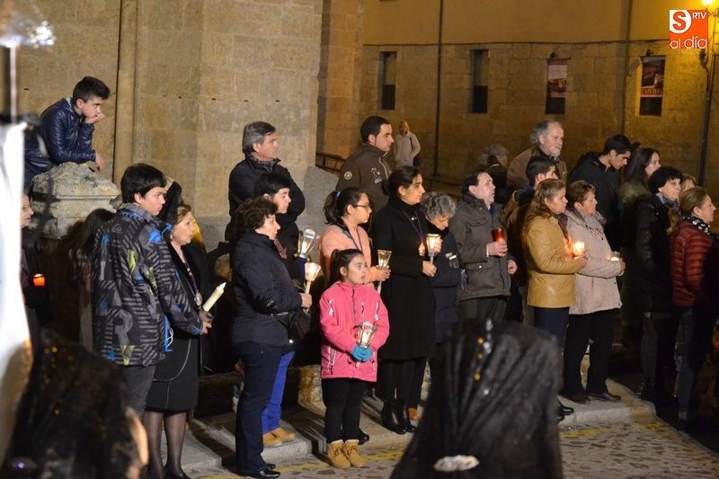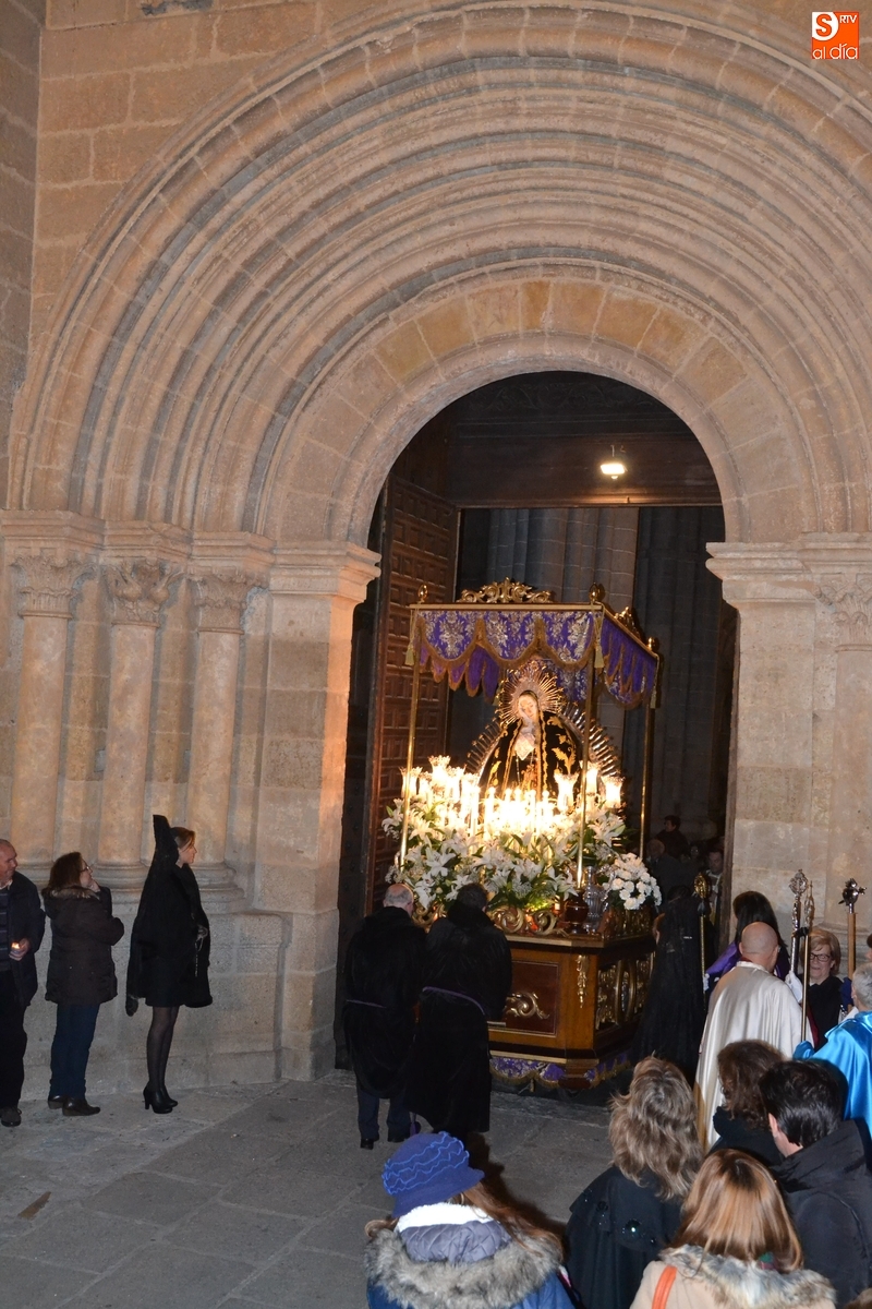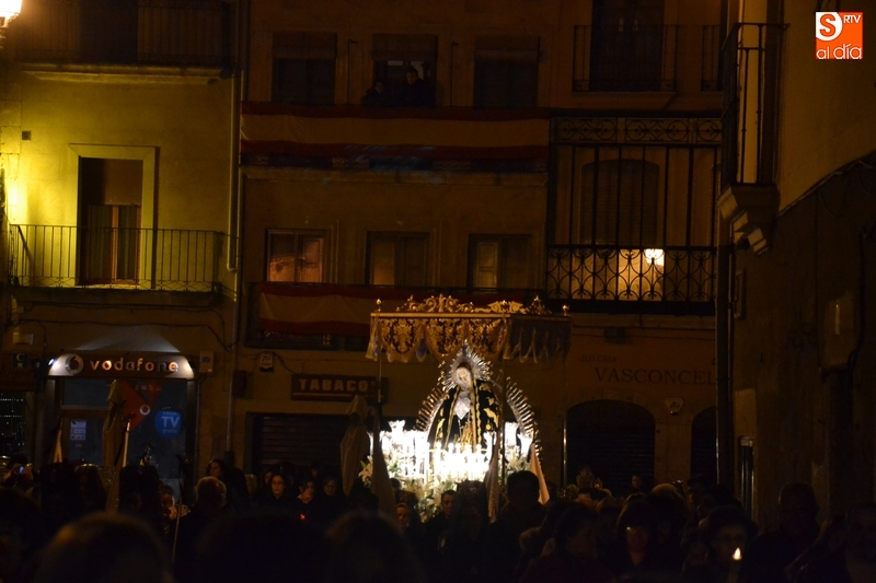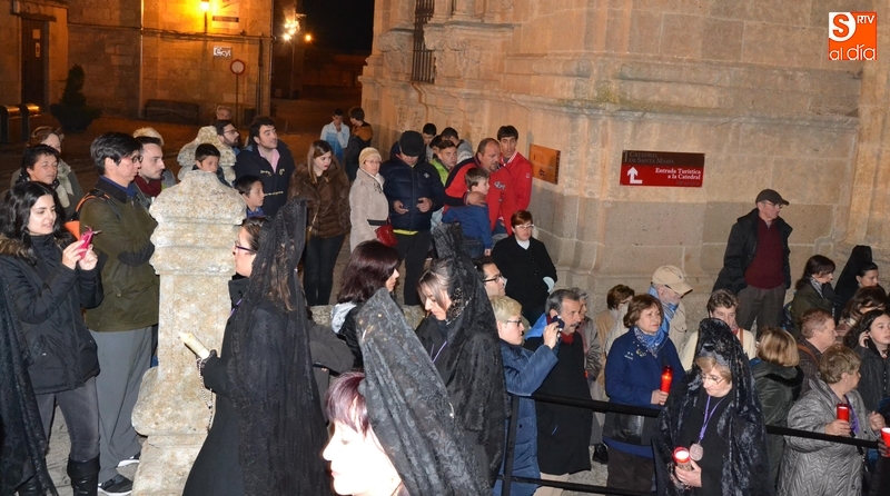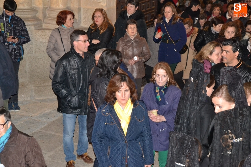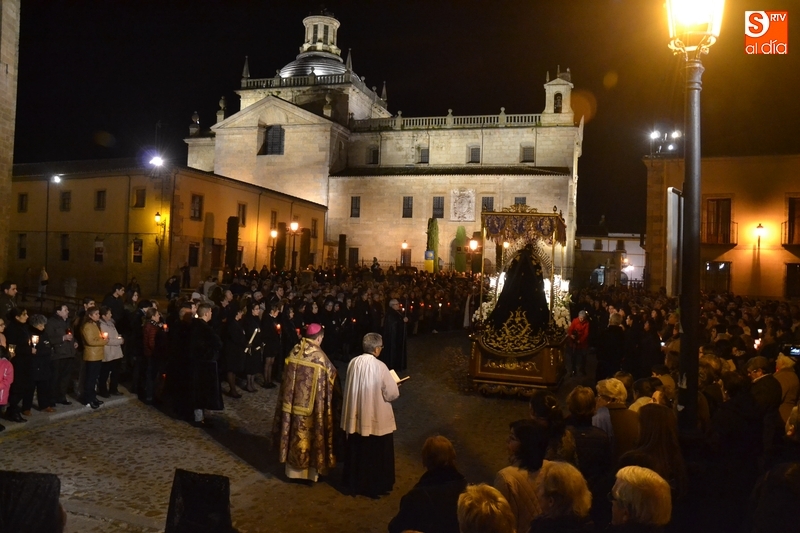 Como es tradición siempre que hace una noche de Viernes Santo agradable, miles de personas salieron a la calle para acompañar a la Virgen en su procesionar por el centro histórico mirobrigense. Eso sí, la gran mayoría de esas personas esperó a la Virgen a las puertas de la Catedral, en vez de asistir al rezo del Rosario y al sermón a cargo del capellán de la Cofradía, Ángel Olivera (como actual presidente del Cabildo Catedralicio), que tuvieron lugar con anterioridad en el interior de la Seo.