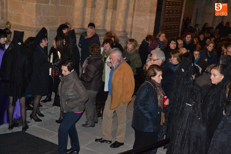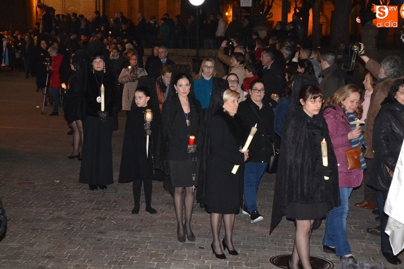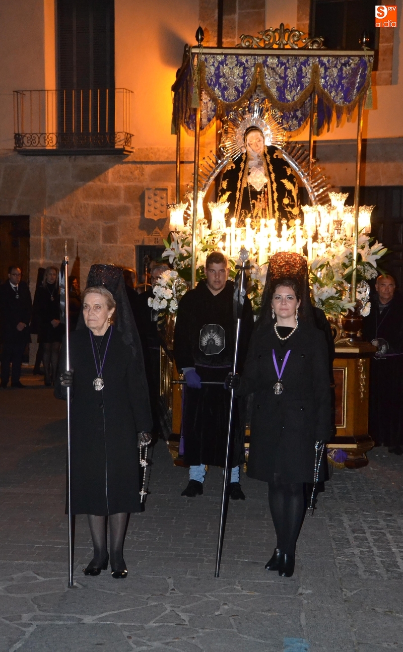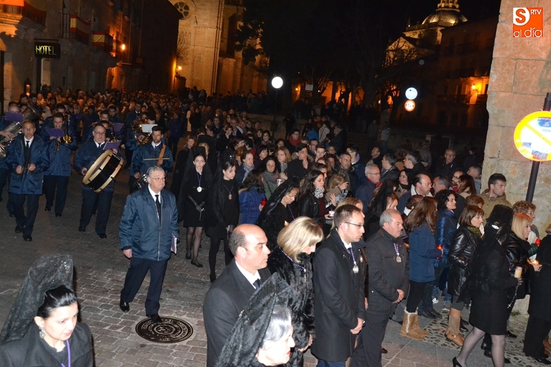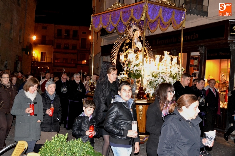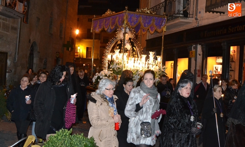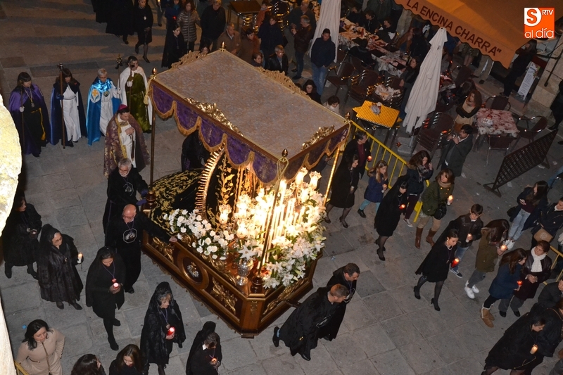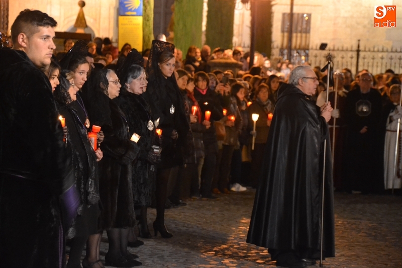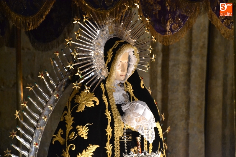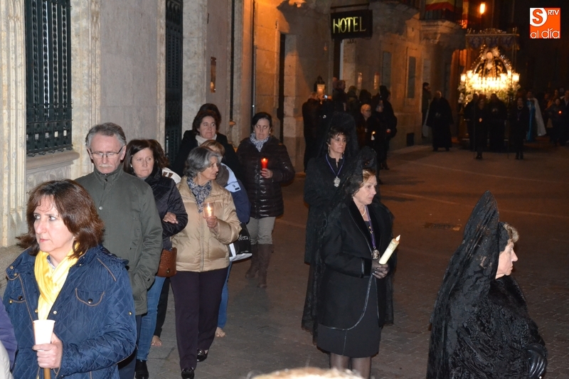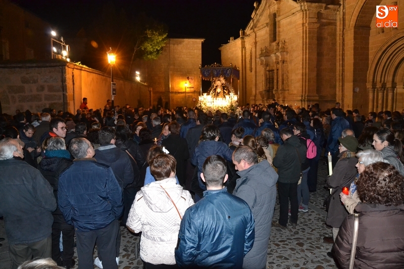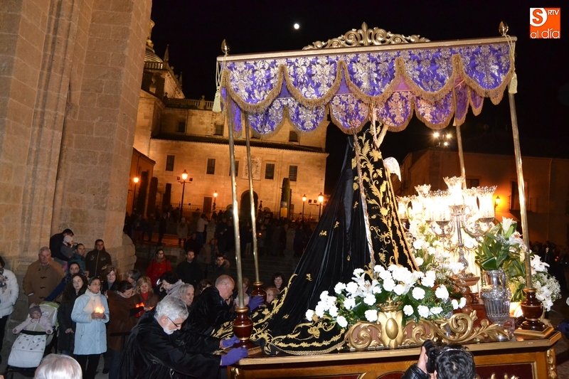 Como es tradición siempre que hace una noche de Viernes Santo agradable, miles de personas salieron a la calle para acompañar a la Virgen en su procesionar por el centro histórico mirobrigense. Eso sí, la gran mayoría de esas personas esperó a la Virgen a las puertas de la Catedral, en vez de asistir al rezo del Rosario y al sermón a cargo del capellán de la Cofradía, Ángel Olivera (como actual presidente del Cabildo Catedralicio), que tuvieron lugar con anterioridad en el interior de la Seo.