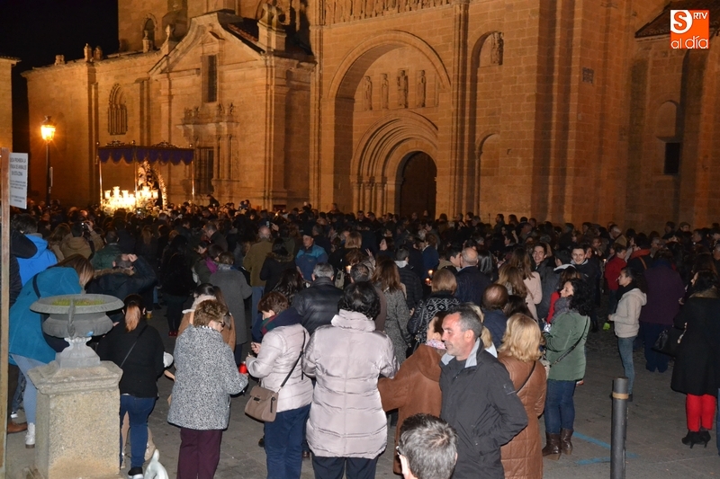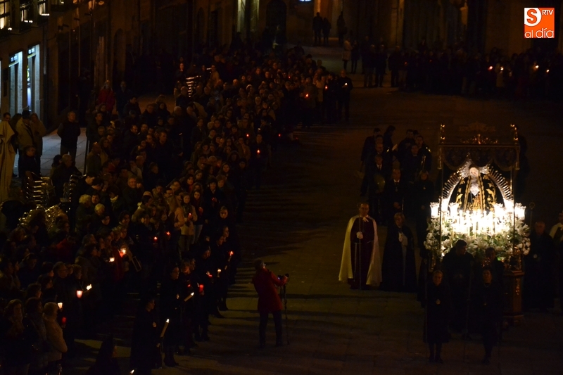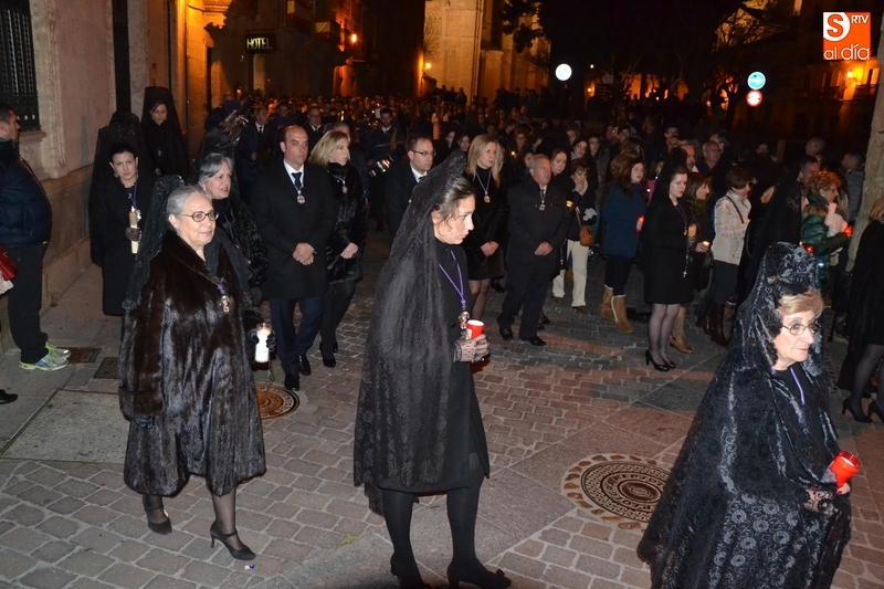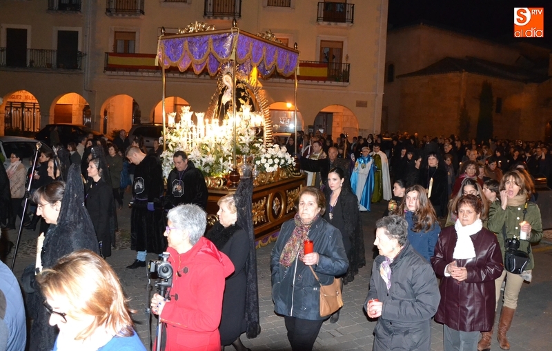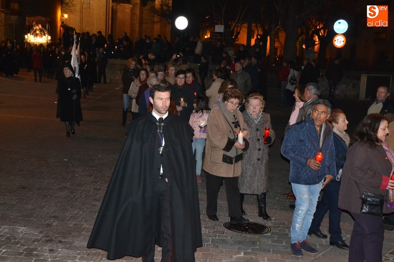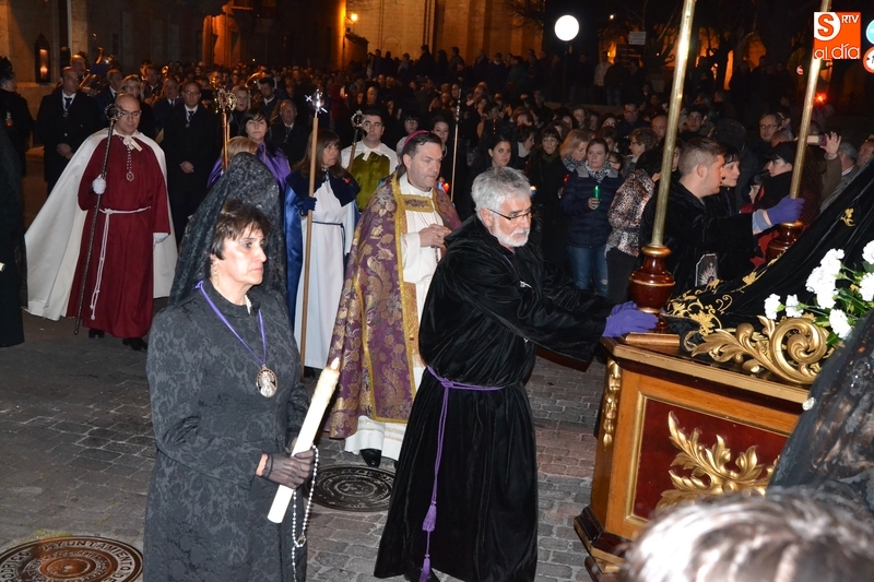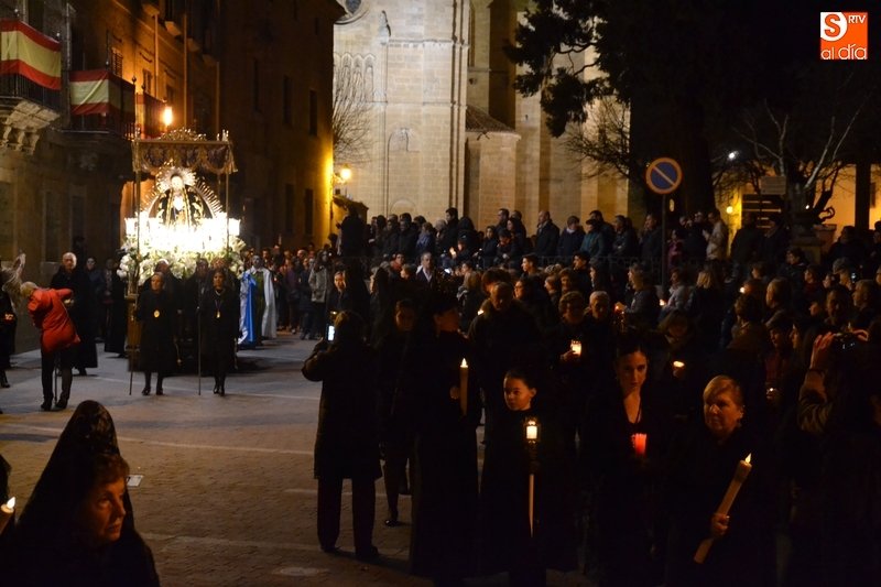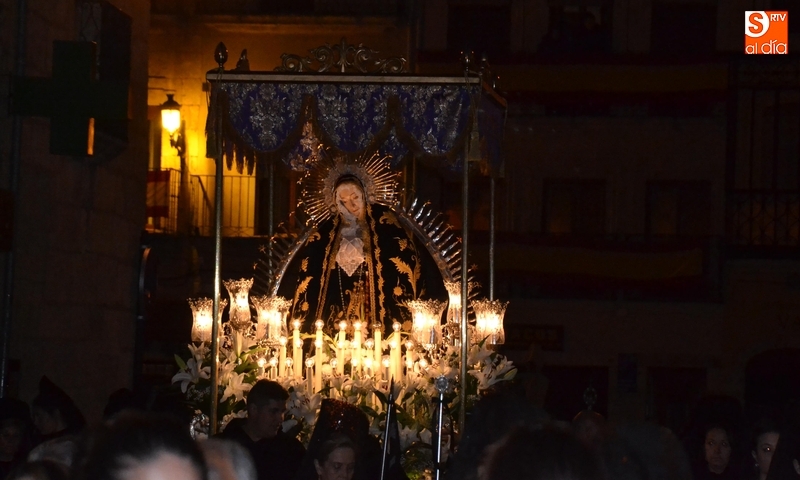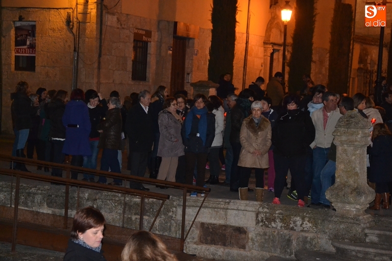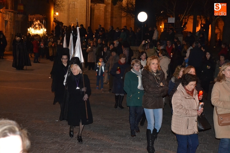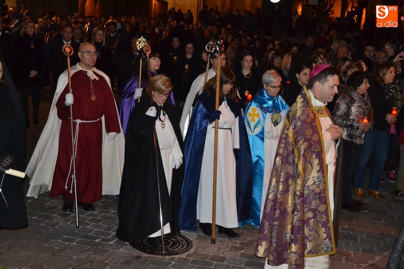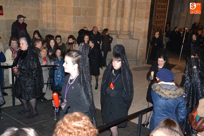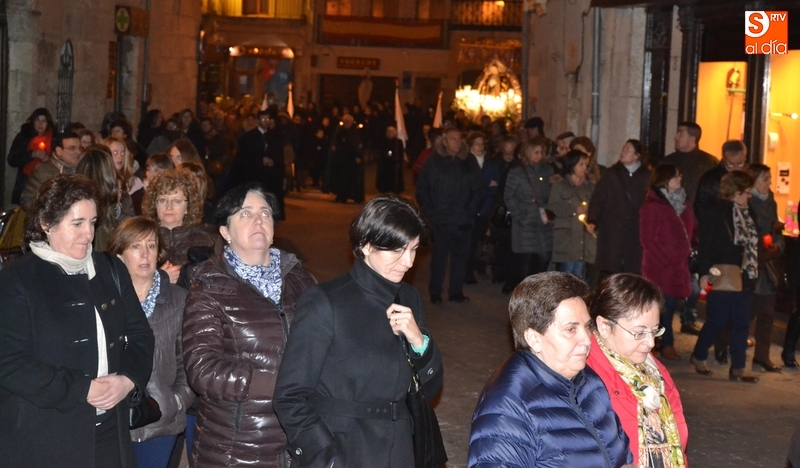 Como es tradición siempre que hace una noche de Viernes Santo agradable, miles de personas salieron a la calle para acompañar a la Virgen en su procesionar por el centro histórico mirobrigense. Eso sí, la gran mayoría de esas personas esperó a la Virgen a las puertas de la Catedral, en vez de asistir al rezo del Rosario y al sermón a cargo del capellán de la Cofradía, Ángel Olivera (como actual presidente del Cabildo Catedralicio), que tuvieron lugar con anterioridad en el interior de la Seo.