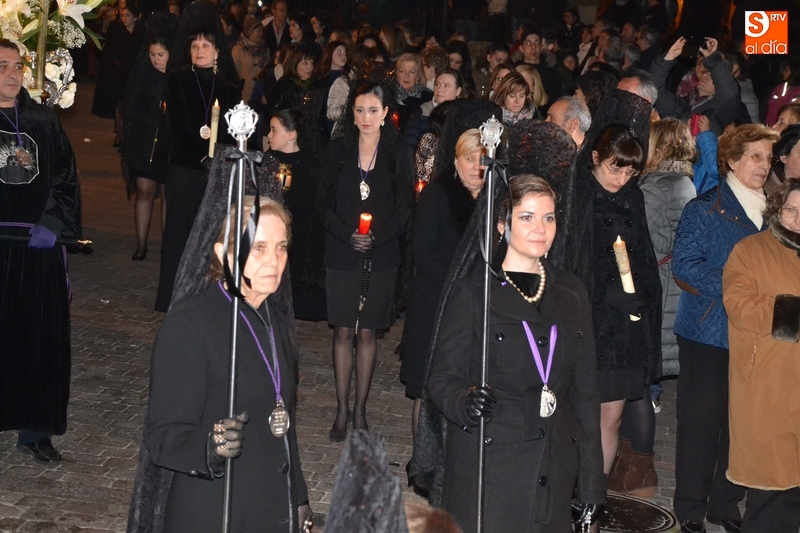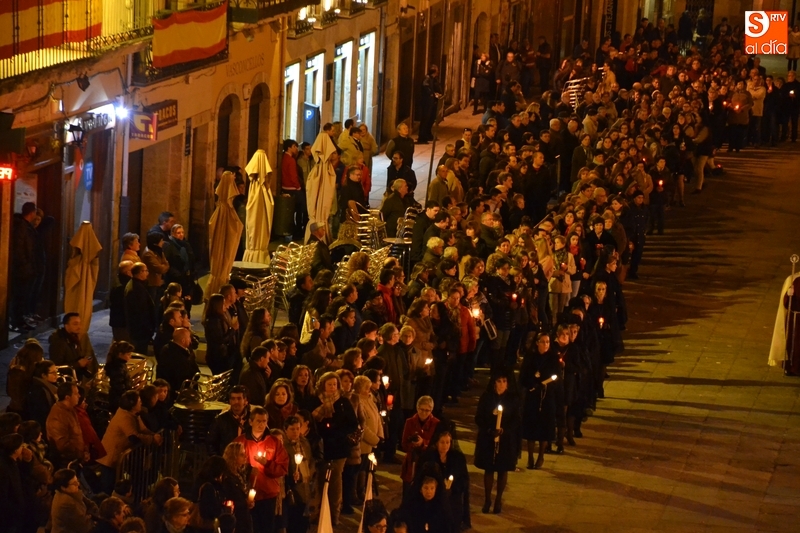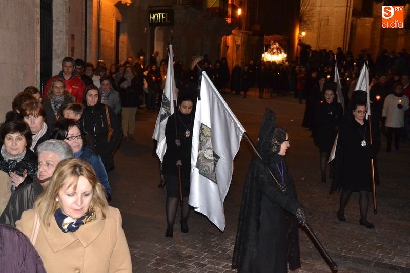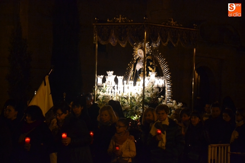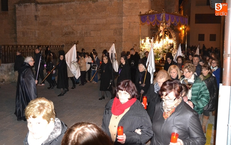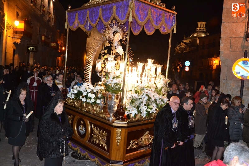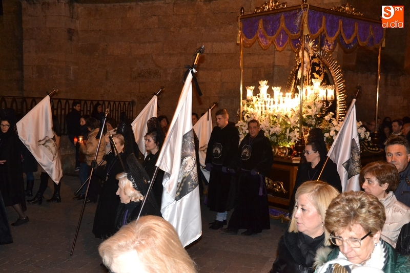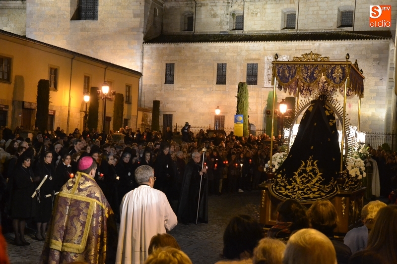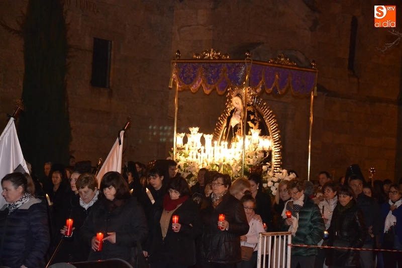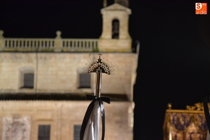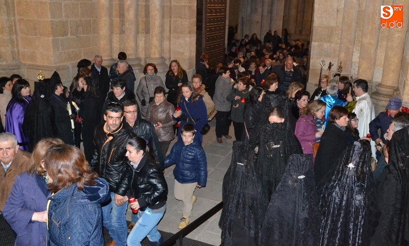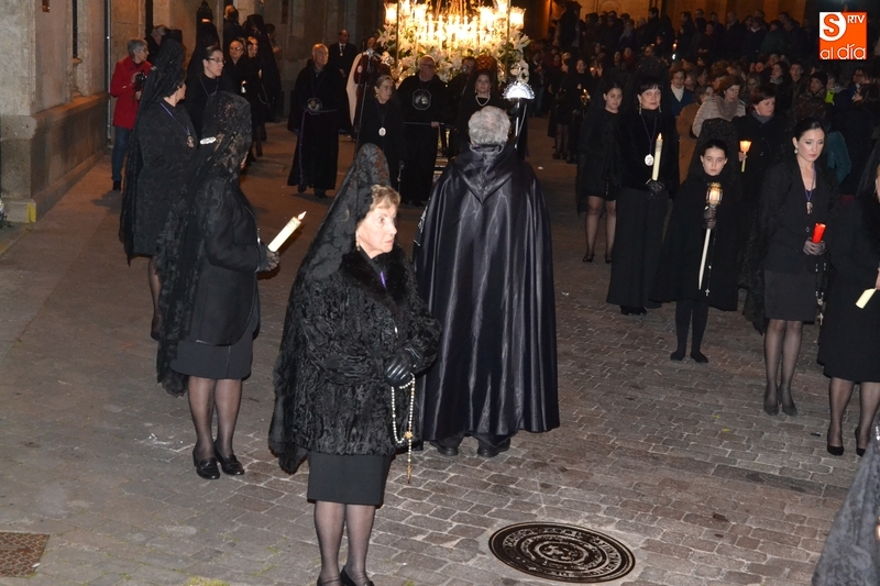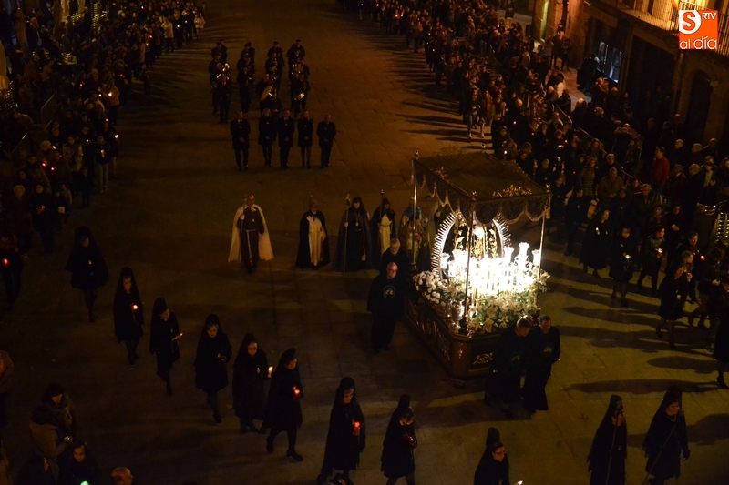 Como es tradición siempre que hace una noche de Viernes Santo agradable, miles de personas salieron a la calle para acompañar a la Virgen en su procesionar por el centro histórico mirobrigense. Eso sí, la gran mayoría de esas personas esperó a la Virgen a las puertas de la Catedral, en vez de asistir al rezo del Rosario y al sermón a cargo del capellán de la Cofradía, Ángel Olivera (como actual presidente del Cabildo Catedralicio), que tuvieron lugar con anterioridad en el interior de la Seo.