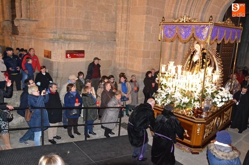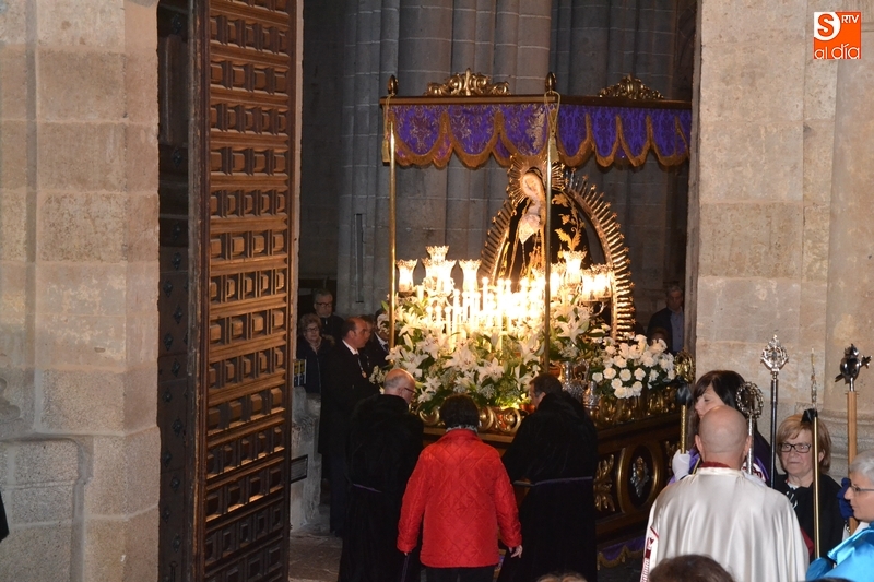 La procesión alcanzó por Julián Sánchez y Cardenal Pacheco la zona de la Catedral, a cuyas puertas se cantó la Salve, mostrando su agradecimiento el presidente de la Cofradía, Arturo Pérez de Burgos, a todos los presentes por su participación. Como despedida, y tras varios vivas a la Virgen, el Obispo y el presidente de la Cofradía, se acercaron a saludar a los representantes políticos, antes de que fuera introducida en la Seo la imagen de la Virgen, tras una hora y cinco minutos de procesión.