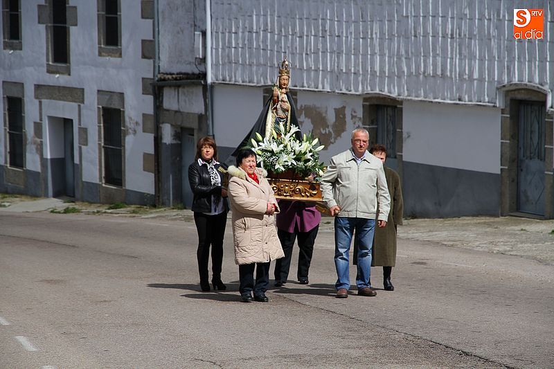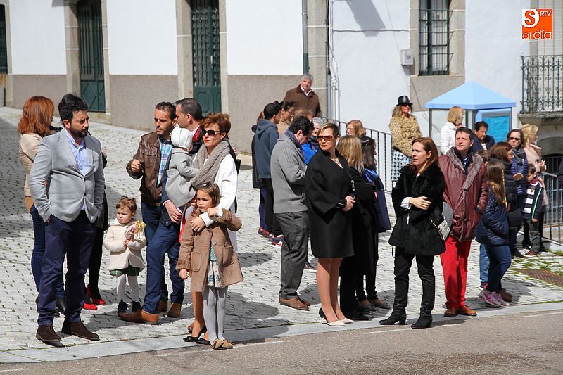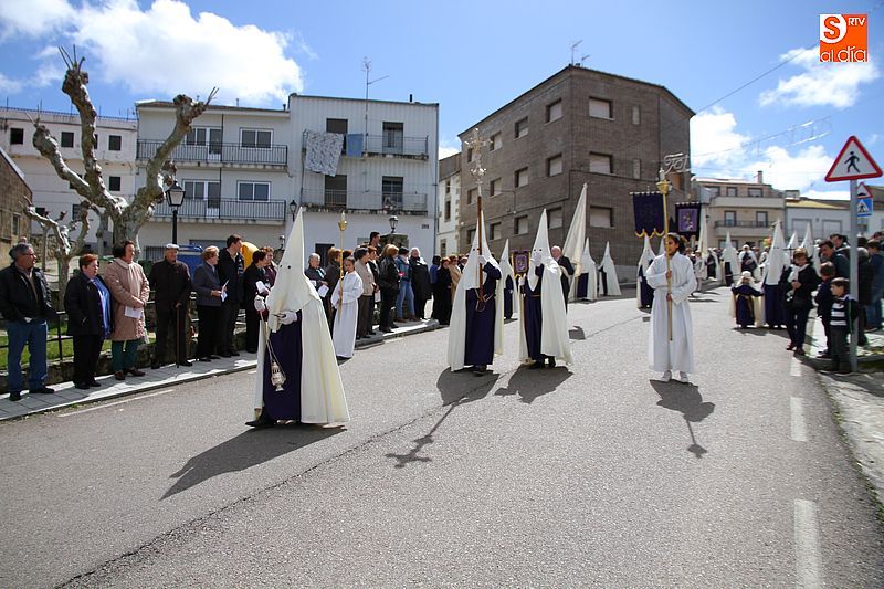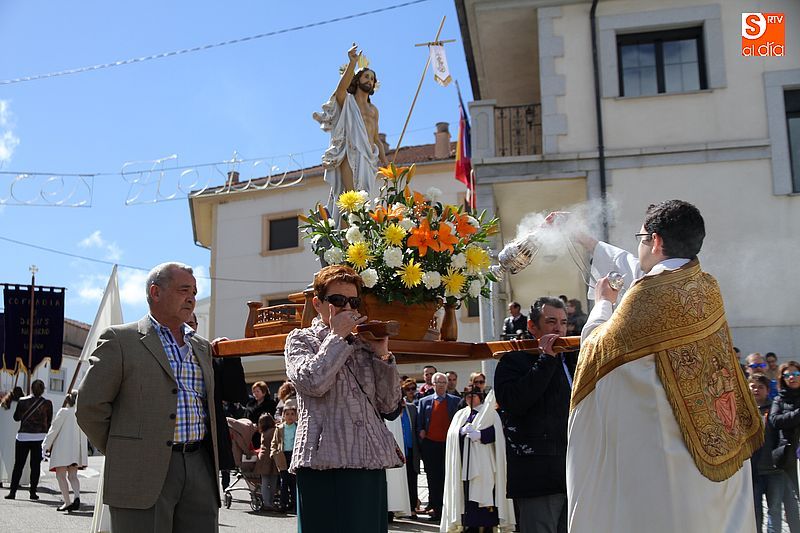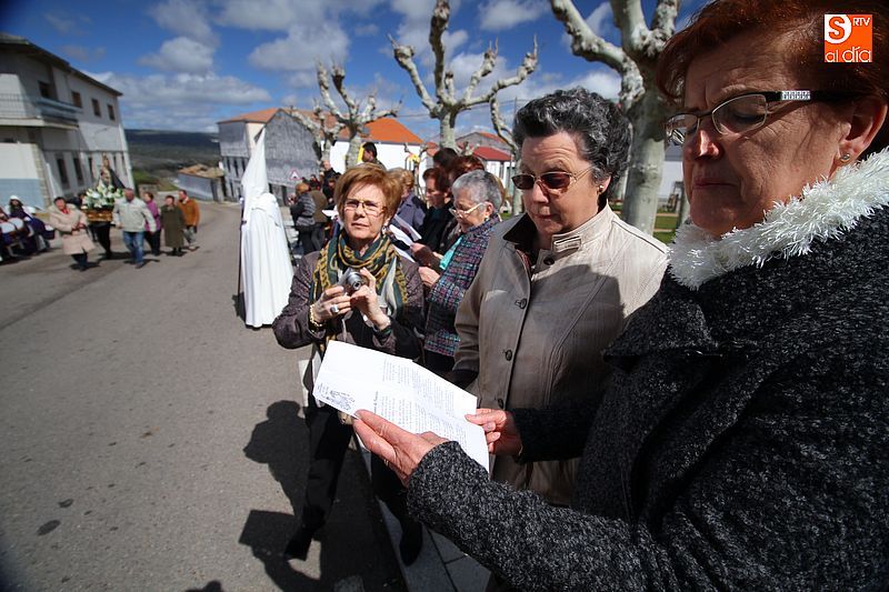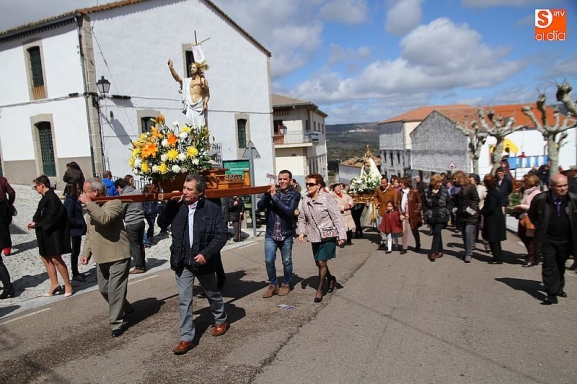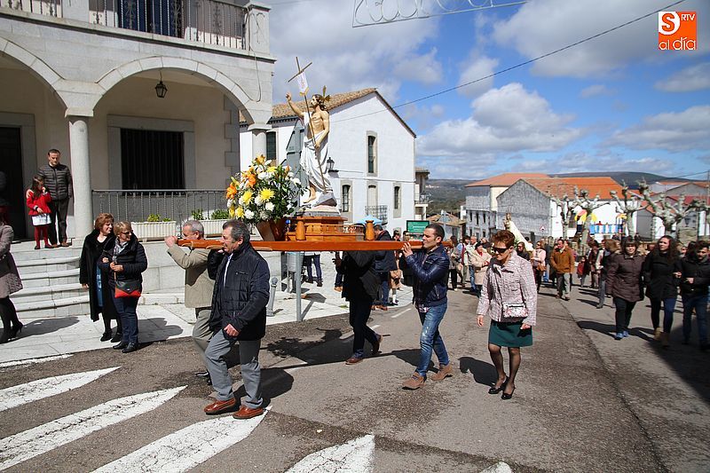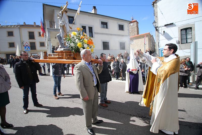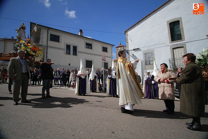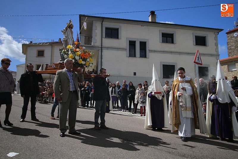 Los fieles de Ledrada disfrutaron hoy del último de los actos litúrgicos con la tradicional Procesión del Encuentro. La Cofradía de Jesús El Nazareno partió de la iglesia portando la imagen de Cristo al encuentro del paso de la Virgen que esperaba enfrente del edificio Consistorial. La mayor novedad del acto fue la imagen de Cristo Resucitado, recientemente donada de manera anónima a la parroquia. En el momento del encuentro de ambas imágenes, el coro parroquial interpretó un himno y el párroco cumplió con el rito de la incesación. Una vez finalizado el encuentro, los cofrades marcharon a buen ritmo, marcado por los tambores hasta la iglesia donde se ofició la Santa Misa.